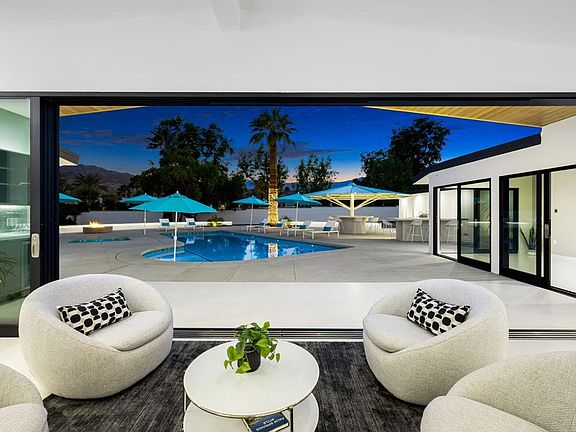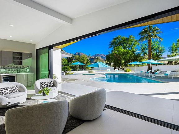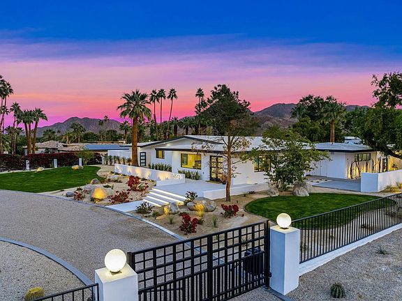 Welcome to this stunning estate. This exceptional property, set on nearly one acre of land, backs up to the renowned Vintage Club, offering breathtaking panoramic mountain views. As you arrive, you're greeted by an extended, dual-gated driveway that provides ample parking for guests, setting the tone for the luxury that lies beyond. Inside, the home's striking features include a wall of fold-away glass doors that seamlessly blend indoor and outdoor living, stunning 40x40 Italian tile flooring, and sleek custom cabinetry. The expansive great room, complete with a linear fireplace, offers ample space for large-scale entertaining and flows effortlessly into the kitchen, backyard, and pool/spa area. This luxurious residence encompasses 3,600 sq ft featuring three en-suite bedrooms and four baths. Smart-home lighting and communication systems, International Keltic Series sliders and windows, and a Miele built-in coffee station elevate the living experience. The primary suite is a true retreat with a private patio and wet bar. The resort-style backyard is an entertainer's dream, featuring an oversized pool with a tanning shelf and five built-in pool seats, a firepit, an outdoor kitchen with a bar, and a charming 1956 Palapa that provides spacious seating. Additional potential for expansion, with room for a casita, pickleball court, tennis court, or a large putting green. This prestigious home combines the best of indoor-outdoor living the Desert is famous for. Truly one of a kind!