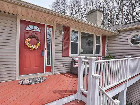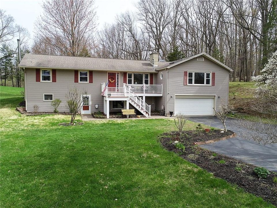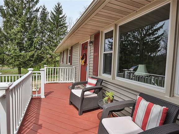 This Scenic slice of heaven is what you've been waiting for. Meticulously maintained and tastefully updated. Enjoy your morning coffee on the front deck with a view of rolling hills. The Open kitchen and dining room concept is today's desired floorplan. Gleaming hardwoods, cathedral ceiling living room with beautiful view, lovely private backyard, turnaround driveway, expansive garage for sports car storage or dream workshop. The walkout basement is "roughly" finished with a cozy wood burning stove and half bath. This house checks all the boxes for the buyer wanting beautiful décor, quality construction, privacy, and convenient location. THIS IS A RANCH STYLE HOUSE WITH STEPS REQUIRED TO THE MAIN LEVEL.