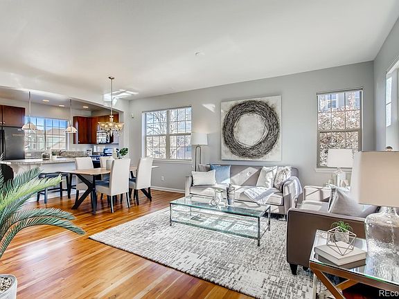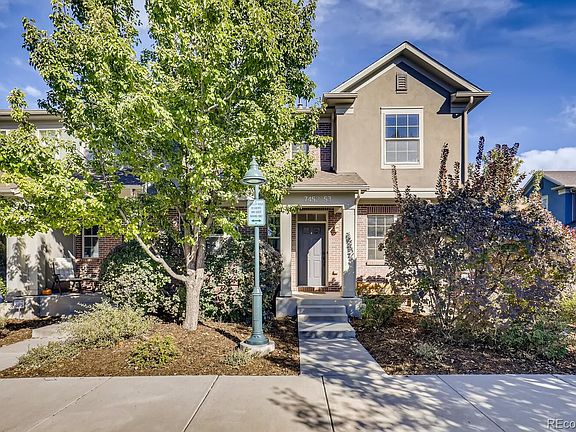 One of the best lots in Crescent Ridge at Lowry. Beautifully maintained and updated. Windows on the north, east and south flood all rooms with light. The main level welcomes you with a large open concept floor plan, perfect for entertaining. Gleaming hardwood floors throughout the main level. The second story has a spacious master suite with large walk in closet just down the hallway from two additional bedrooms and bathroom. Brand new carpet throughout the upper level is plush and soft. This home lives like a single family detached house, it has been exceptionally well kept, freshly painted, and is ready for its new owners. Enjoy your charming front porch one block from Crescent Park and minutes from the Lowry Town Center. Attached two car garage and an excellent HOA that maintains the beautiful landscaping.