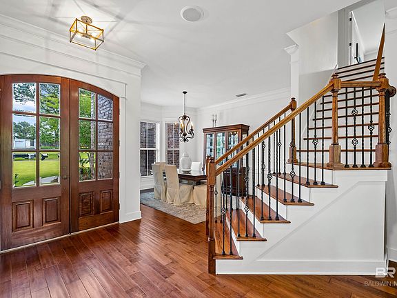 PRIVATE LAKEFRONT LIVING AT ITS BEST! This custom-designed home featuring an open floor plan connecting the living room, kitchen, and morning room, alongside a formal dining room. This spacious four-bedroom home includes four and a half bathrooms, a den, and an upstairs bonus room with potential for a fifth bedroom. Each bedroom has a private bathroom. The expansive downstairs primary suite offers two walk-in closets, lake views, and private porch/deck access. The attached bathroom has a custom tiled shower, double sinks, granite countertops, a private toilet, and a jetted tub. An additional downstairs bedroom with an en-suite bath provides flexibility and is the perfect area for a home office. The living room features hardwood floors, tall ceilings, a gas fireplace, built-in shelving, and lake-view windows. The formal dining room includes wainscoting. From the 3-car garage there is a landing area that provides access to the utility room, coat closet, and a storage closet and leads into the kitchen. The chef's kitchen is equipped with a 36" six-burner gas range, ample cabinetry, a pantry, quartz countertops, and updated fixtures. The adjacent den is ideal for relaxation. A hall leads to a half-bath off the den and to the porch and deck. Upstairs are the remaining bedrooms, each with a full bathroom, walk in closets, and a large bonus/playroom. The home offers significant storage, including a floored and lighted professionally landscaped three-quarter-acre Lakefront lot has zoysia grass and a sprinkler system. Overlooking a natural wooded area, enjoy privacy, a spacious deck, and a private pier for fishing, paddle boarding or kayaking. Other notable things include two tankless water heaters less than 3 years old, two HVAC units that are less than 3 years old, and zoned for better control. located near I-10 with easy access to Pensacola and Mobile, this property offers peaceful living close to town in Spanish Fort, Al. Buyer to verify all items of importance. Buye