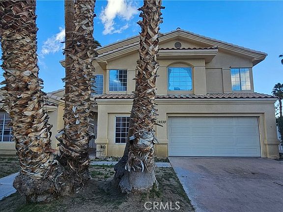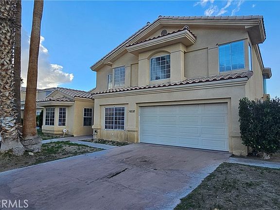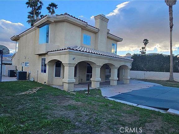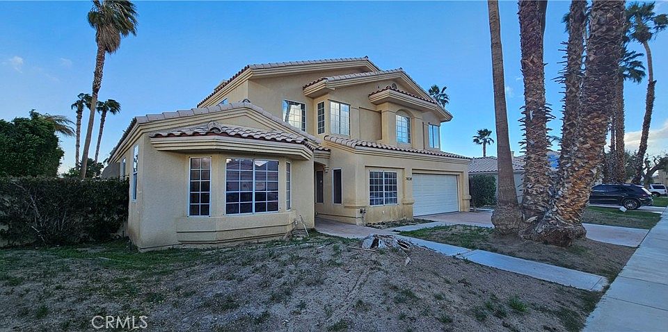 Amazing potential on this 5 bedroom 3 bathroom two story Palm Desert Gate pool home. This 3204 square foot home was built in 1992 and sits on a large 8712 square foot lot. The formal entry opens to the great room and stairs on the left with ceramic tile from the entry through the rear of the home. THe great room features laminate flooring from the front of the home to the kitchen with chandelier overhead. The kitchen is a good size with plumbing and electrical ready for you to install the kitchen of your dreams with overhead lighting and plenty of windows to view into the backyard. The family room features a fireplace and large media niche with ceiling fan overhead. Beyond the family room is the downstairs laundry as well as bathroom with shower. The bathroom splits two multi purpose rooms that can be used as bedrooms or offices. The remaining bedrooms are upstairs featuring two bedrooms connected with a shared bathroom. The enormous primary suite features laminate flooring with a fireplace, overhead ceiling fan and a bathroom highlighted by a large soaking tub and separate shower. The bathroom is also plumbed and has electrical ready for installation of vanities and fixtures. The backyard is a very good size with plenty of trees, as well as an inground pool. This home is conveniently close to shopping, dining and entertainment as well as Highway 111 access.