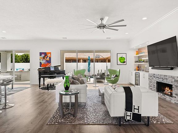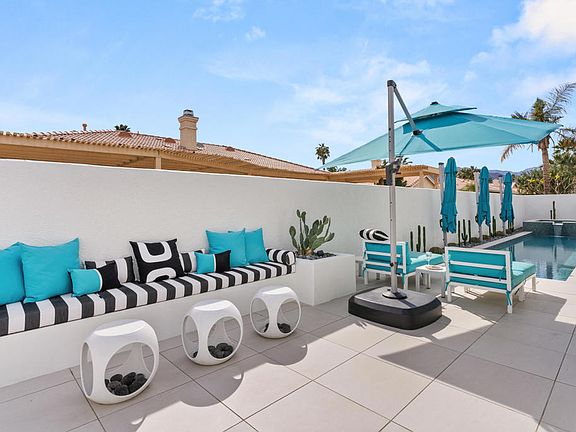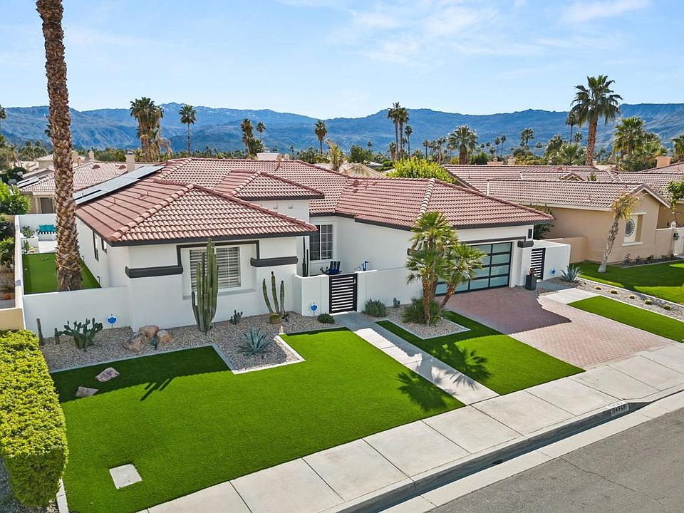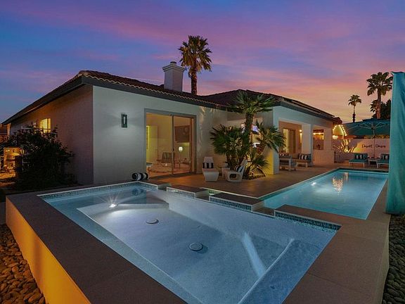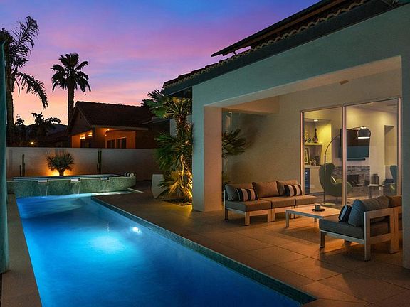 This stunning open-concept home is a south-facing ''Desert Oasis'' maximized to its fullest potential, and is sure to captivate buyers in search of an exceptional property. The current owner has meticulously renovated both the interior and exterior of the home, creating a luxurious and inviting atmosphere perfect for entertaining. Standout features include: a new modern custom-built pool and spacious spa with designer tile and multiple waterfalls, commercial in-ground cantilever umbrellas, and high-end pool equipment with chiller/heater combo for year-round enjoyment. The low maintenance landscaping features premium-grade USA made turf and all new drip-irrigation system, entry courtyard with water feature, porcelain decking, and a bocce ball court. Inside, the home boasts a spacious open great room with a huge kitchen island, new stainless-steel appliances, a chic bar station, and a striking stacked stone fireplace. The primary retreat is conveniently located just steps away from the spa and features a spacious walk-in California Closet and a walk-in shower. Additional amenities include a paid solar system, a newer HVAC system, a linear fire pit with seating, an outdoor kitchen with built-in BBQ and Dektron countertops, a modern metal/glass garage door, and much more. The property is conveniently situated near El Paseo shopping, dining, and golfing options and without an HOA. Please inquire for a detailed list of upgrades. Select furnishings are negotiable outside of escrow.