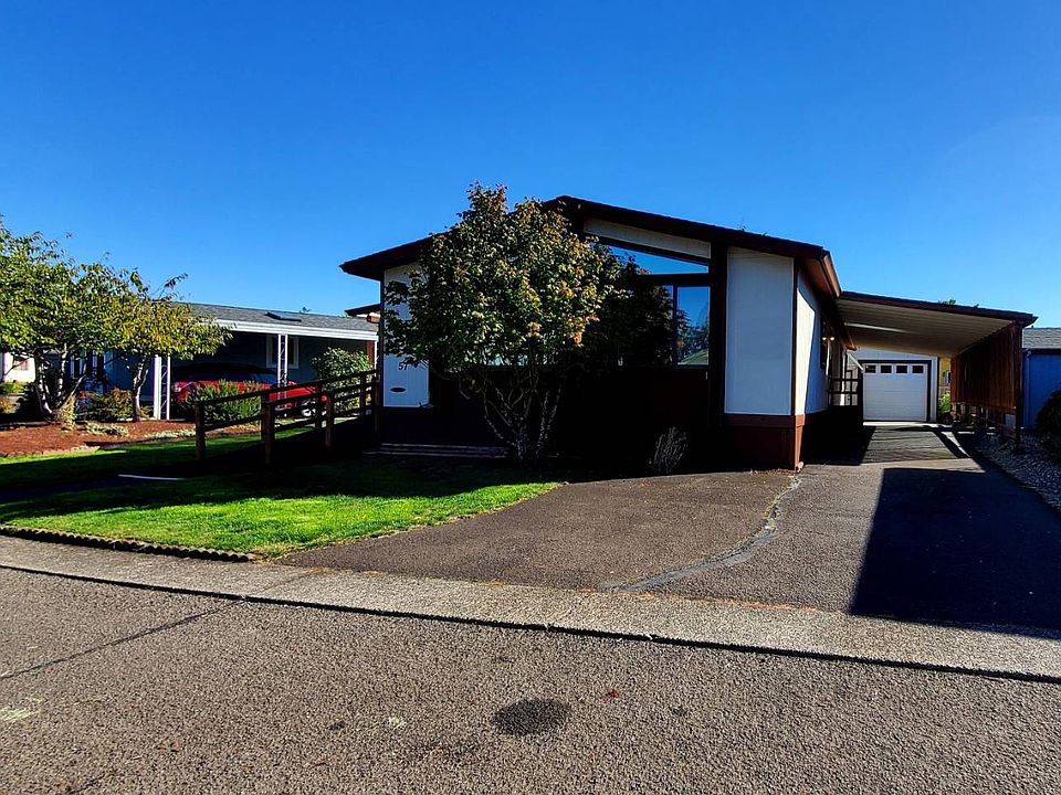 Welcome home to this beautiful 3 bedroom, 2 bath Golden West, Sunnybrook with garage. This is a manufactured home in a Senior 55+ Park and NO land is involved with the sale of this home. This wonderful home offers approximately 1344 SF of room with split living and family room areas. The living room is graced with large windows complete with celestial windows and paddle fan, dining room features built in China hutch, kitchen offers lots of counter top space with tons of cabinets, stainless refrigerator with water & ice and stainless dishwasher, glass top stove, pantry and skylight, large main bedroom features walk in closet and en suite bathroom with double sinks, garden tub and walk in shower, guest bath includes one piece tub shower combo and skylight and laundry room features washer and dryer, extra cabinets and tube skylight. Living room measures approximately 12x14', family room 12x12', dining room 9x9', main bedroom 11.5x15.5', 2nd bedroom 10x10.5', 3rd bedroom 10x11' and 8x9' utility room. Front deck measures approximately 8x14' with 18x4' ramp and 9x10' awning, fenced back yard features 25x12' patio area and raised garden beds, rear deck 3x6', carport 12.5x40' and 16x26' garage. Enough room for 4 cars in the driveway! Roof replaced in 2012. New water heater. Heat pump for economical heating and cooling. Heat pump and furnace were replaced in 2019. Pet policy: 2 pets to 20 lbs. Located in Terri Lynne a wonderful Senior (55+) Community close to bus, freeway, Max, shopping, restaurants and so much more! Base park rent at Terri Lynne is $1,100 per month.