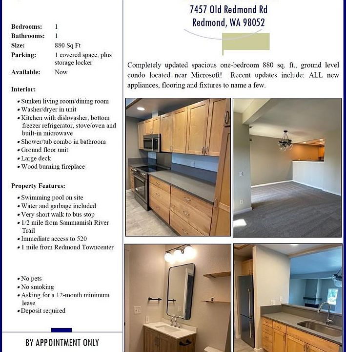 This 880 square foot apartment home has 1 bedrooms and 1.0 bathrooms. This home is located at 7457 Old Redmond Rd, Redmond, WA 98052.