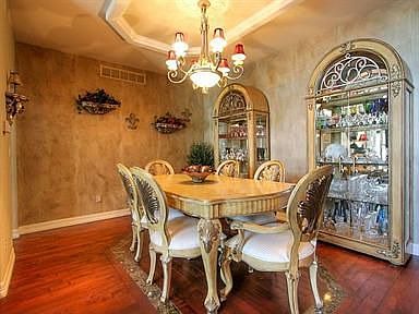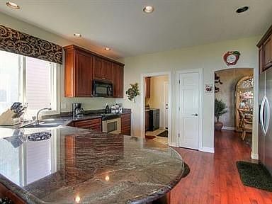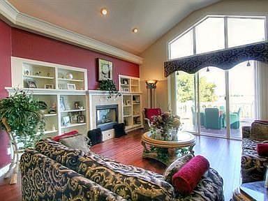 Stunning updates await you when you enter this beautiful home that features a dramatic travertine and marble entry that leads to a spacious living room with cherrywood floors. The living room features built-in shelving, a wall of windows looking out on the lake, and a 2-sided fireplace shared with the master suite. A formal dining area boasts coffered ceiling and a faux finish. The chef in the family will love the gourmet kitchen that has slab granite, a large breakfast bar, breakfast nook with a bay window, 42? cherry cabinets, smooth-top range, two ovens, and a microwave. The large master bedroom will be your private oasis with a cozy fireplace, access to the deck, walk-in closet, and a beautifully tiled master bathroom with a jetted tub, decorative tile shower and granite vanity. There is a 2nd bedroom that can be a home office on the main floor, and two large bedrooms in the finished basement. The walkout basement was made to show off, with a home theater that has a built-in entertainment center, and a game room with a granite wet bar that has a fridge, dishwasher, and built-in cabinets and wine racks. Entertain on the fabulous deck or covered walkout stamped-concrete patio. Both offer terrific lakefront views as you listen to the tranquil water feature. It?s the perfect place for a back yard barbeque or quiet get-together with friends and family