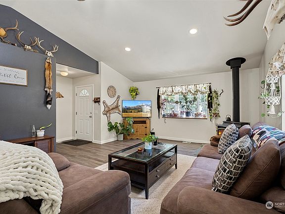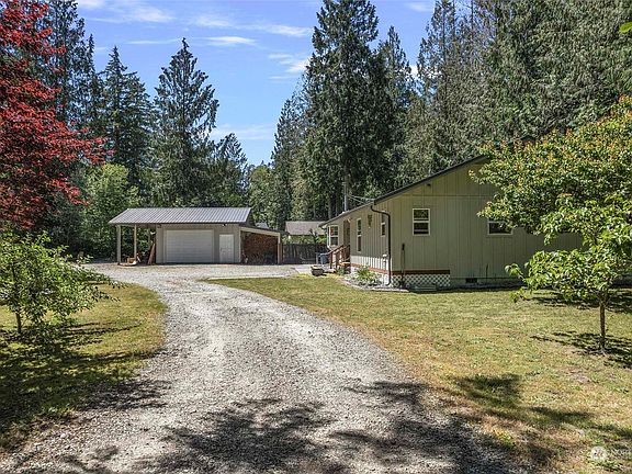Open floor plan corner lot rambler with abundant windows, rich vinyl plank flooring, shop, fruit trees, and garden space along a gorgeous greenbelt near the Skagit River. The living room features vaulted ceiling and charming corner stove. Light and bright kitchen with oversized eating counter and plenty of storage. Primary bedroom includes attached bath with storage. Gorgeous outdoor space with partially fenced yard and oversized, partially covered patio plus garden beds, fire pit, and RV parking. Shop features roll up door, and a man door, plus covered outdoor storage for both firewood and toys. Home features a low maintenance metal roof, forced air heating and cooling, and is wired for a generator!