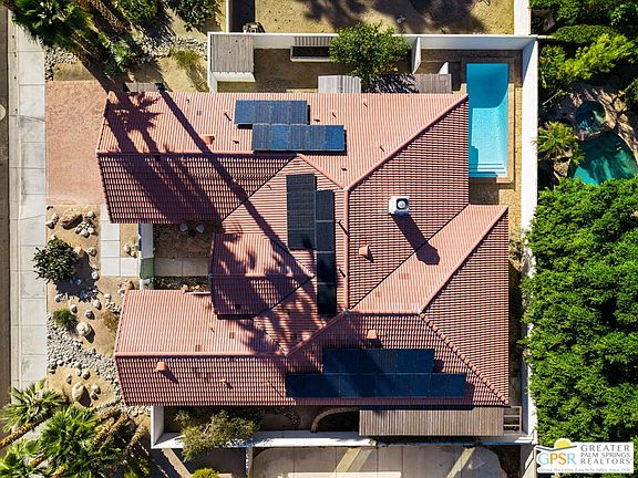 Enter the gated courtyard, which welcomes you to an oversized, open-concept living space with soaring ceilings. The kitchen features an enormous island where the whole family can gather around and dine, with tremendous storage. A cozy fireplace is at the center of the large living room, overlooking the backyard with plenty of natural light. A bonus room off the living area is perfect for an office space, play room or art studio. The primary bedroom offers pool access, a large ensuite bath with two vanities and a massive walk-in closet. Two large guest rooms share a jack and Jill bath. A separate powder room and large laundry room complete this well-appointed home in the heart of Palm Desert, close to dining and shopping. Other highlights include: mountain views, large covered patio space, sparkling pool, solar and a 2-car attached garage! No HOA! Freshly painted inside and out with new flooring in the guest rooms and bath.