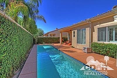 Gorgeous 2500 SqFt single story home, South facing patio & lap pool. Remote control awning w/auto closing wind sensor. Cooks kitchen features Whirlpool Gold Appliances including a French door refrigerator w/bottom freezer, granite counter tops w/matching back splash...large island breakfast bar w/seating for four open to great room. Decorator colors, Plantation Shutters, fireplace, Patio & BBQ. Two Bedrooms plus Office or possible Third Bedroom, 2 en-suite bathrooms plus powder room, extra large MBR walk in closet with full length mirror doors. Spacious indoor laundry room w/deep sink & overhead cabinets. Cedar front entry gate leading into a wraparound courtyard leading to the South facing Salt Water Heated Lap Pool. Sliding doors from Master Bedroom lead to a quiet patio for relaxing with a glass of wine or refreshing morning coffee. Low maintenance & low water landscape w/drip irrigation. Close to schools, churches, shopping & dining near El Paseo. Solar 114 Mo Assumable.