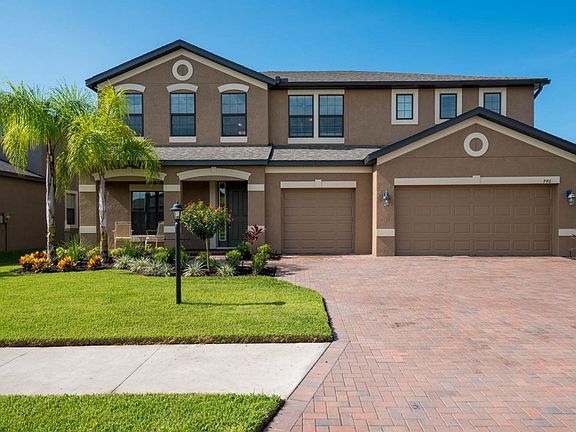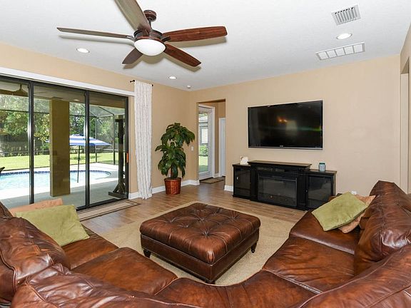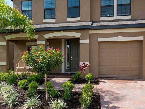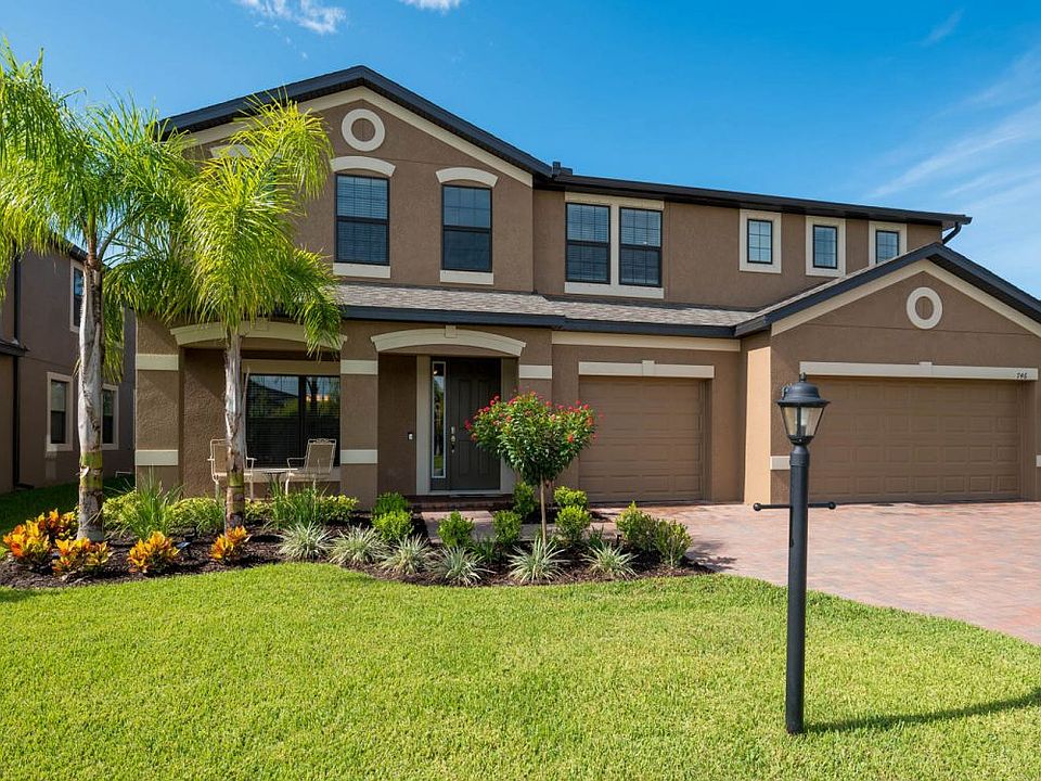 Shows like a model this better than new home has master bedroom plus three bedrooms and a spacious game room upstairs and one guest bedroom downstairs. Two HVAC's so each floor can maintain even cooling for your comfort. The extra large (32" x 14") Pebble Tech salt water heated pool has two 12" fountains, a sun shelf, bubbler and umbrella holder. Many upgrades have been made to this Santina II model home built by MI Homes including kitchen cabinet crown molding top and bottom, under cabinet lighting, double ovens, finished cabinet panels on sides, 24" cabinet over refrigerator, all GE Profile SS appliances and granite countertops, 6" x 24" Forestland Birch tile by Gulftile throughout main level, carpet on 2nd level, baseboards upgraded to 5 ½", A/C unit was put on side of home instead of back for noise control, can lighting, tray ceilings in game room and master bedroom.