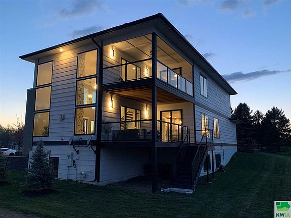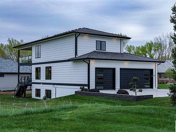 This one of a kind Dakota Dunes Country Club home is sleek, modern, and custom in every detail. It sits on a 1/2 acre corner lot with unobstructed views near the Number 10 Green. Soaring floor to ceiling windows in the 2 story great room offer dramatic views and extraordinary curb appeal. Incredible attention has been focused on quality and keeping with contemporary design. This includes outdoor lighting, interior fixtures and surfaces. The high end kitchen features streamlined Bosch appliances; purposeful and beautiful! The sleek black granite island is appointed with designer light pendants. Stunning open views from the kitchen to the dining room, deck, and great room make for perfect entertaining. The great room features floor to ceiling custom stone fireplace for family and friends to gather. This striking feature is set off by expansive 2 stories of windows. Wow! Moving out to the first of two decks you'll enjoy private and unobstructed views. Party? Up the floating staircase set off by the breathtaking entry windows, you are taken to the master, 2 additional bedrooms (each with their own ensuite) and a laundry room. Patio doors in the master entice you to the second private deck where you can sip your morning coffee and enjoy the Dakota Dunes sun rises. The large master ensuite features large soaking tub, floor to ceiling tiled shower for 2, double vanity and walk in closet. This is 2400 SF of pure elegance. Oh wait ... there's a spacious 3 car garage and a basement with 3 large garden windows ready to finish for a family room, bar, 4th bedroom, and bath!