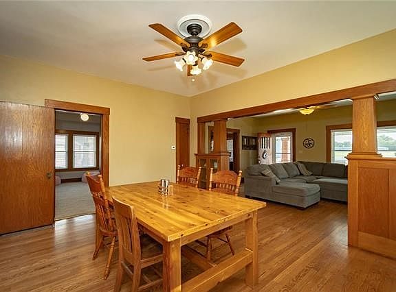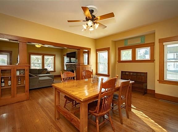 Beautifully restored historical Craftsman style home with so much charm! If you love old homes, this one is for you. Beautiful hardwood floors, large living room with wood burning fireplace, formal dining room with built-in curio cabinets and desk, beveled glass French doors, eat-in kitchen with large windows and window seat and exposed chimney. Three bedroom on main level. Original transom windows on main level. Upstairs has a 4th bedroom with a full bath. Basement is large and open. Has it's own outside access, full bath and option to add additional non-conforming bedroom. Use this space for additional family room, storage, workshop, etc. Even has the original door for the old coal shoot for charm. EXTRA large lot (was originally 2 homesteads on the property) for plenty of space. Home also has TWO 2-car garages!! Garage 1 is 24x24 with concrete floor and double garage door openers. Garage 2 is 26x23 with concrete floor, work bench and shelving are staying.