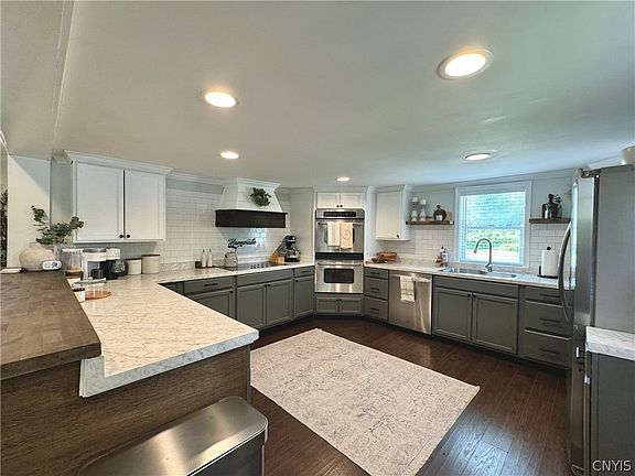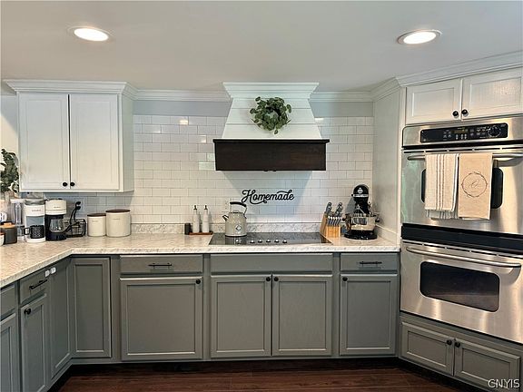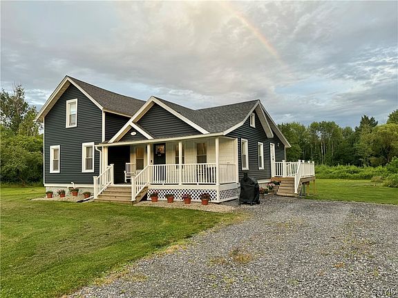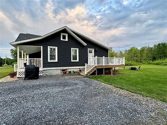 Welcome to this beautifully remodeled, modern farmhouse! Step inside the spacious dining room with cathedral ceilings featuring rustic wood beams. The large kitchen has plenty of counter space, stylish subway tile, double ovens, and wood shelving. Two first floor bedrooms and full bathroom with subway tiled tub/shower and laminated wood countertop. First floor laundry with newer washer/dryer. Upstairs is the master loft with pitched shiplap ceiling, wood beams, antique chandelier, and full master bath with tiled shower. New wrap around side porch and deck to enjoy the view of your 4 acres. Located within the Chittenango school district. Schedule your tour today!