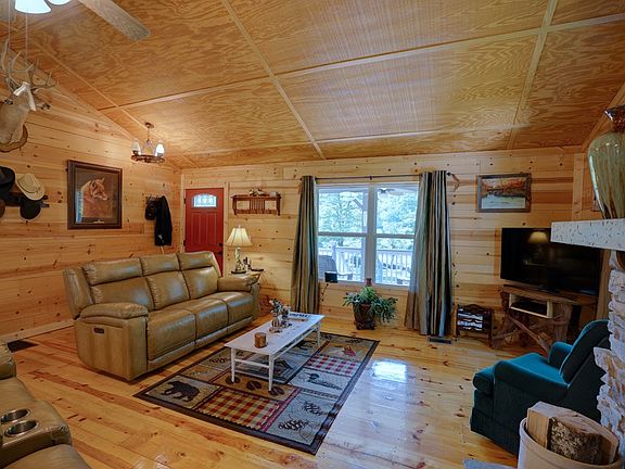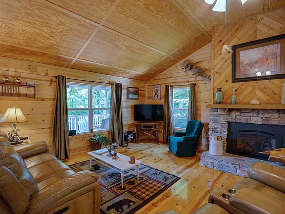 PRICED REDUCED!!! 2 Bedroom/ 3 Bath cabin sitting on 1.19 acres with over 435 foot of bold creek frontage & your own private pond! Cabin features an open living/kitchen with stacked stone gas-log fireplace & large kitchen with ample cabinet & counter space. The laundry/ mudroom addition includes utility sink & a custom-made rustic pantry. Rocking chair front porch extends along the entire length of the home creating a convenient outdoor living area. Covered deck just off the dining area features new french doors & a retractable screen door. Two storage buildings if you need a workshop or a place to store your toys. Do you have relatives that come & stay longer than they should? With the two RV hookups on the property you can still have your own space & so can they. Other upgrades include all new vinyl windows, new fiberglass front door & vinyl storm door w/ retractable screen, & a newly installed energy efficient gas fireplace & a newly constructed 18x32 garage. Perfect for weekend getaways or even a rental.Great location close to Fontana Dam, Tail of the Dragon, Bryson City, & Cherokee, NC...motorcycle friendly, year round access & no deed restrictions! Furnishings are negotiable
