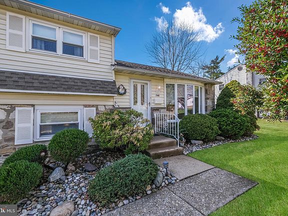 Large ~ stone front split level opens to formal Living room with floor to ceiling bow window, wall to wall carpeting that flows into formal dining room with halfway to eat-in kitchen. Kitchen features center island with seating for two. Solid white oak cabinetry with cathedral raised panel doors, gas range with overhead microwave + built-in dishwasher. Steps from kitchen to large lower level Family room with built-in cabinetry and full stone wall fireplace and two double hung windows, two large storage rooms off Family Room with side door to backyard. Lower level powder room and Utility room with full size washer and dryer and large laundry tub with door to covered patio with stone wall. Upper level features Hall bath with tub shower surround. Master Bedroom with double closet and ceiling fan. Two additional bedrooms; each with large closet and wall to wall carpeting. Hardwood flooring under wall to wall carpet in Living room, Dining Room, stairs and bedrooms. Covid & PAN Addendums to be completed and submitted prior to showings.