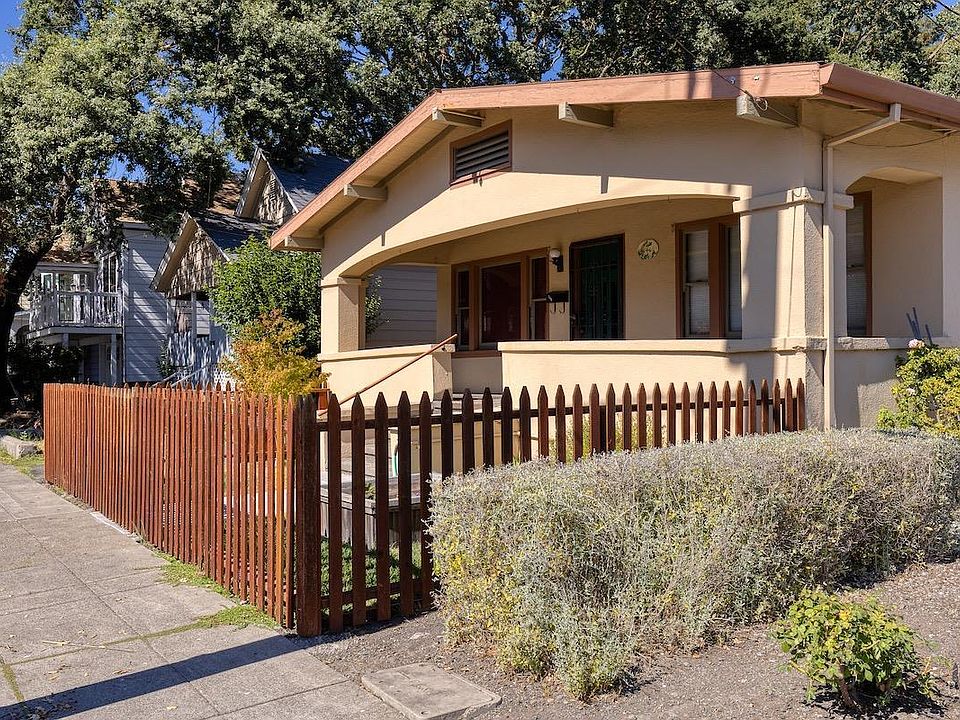 Welcome to this charming California bungalow nestled in the heart of downtown Santa Rosa. Built in 1927, this classic home exudes character and offers a unique opportunity to walk to Railroad Square. This delightful home features three bedrooms, providing ample space for a growing family or those in need of a home office. The well-appointed bathroom boasts vintage charm and is thoughtfully designed to meet your everyday needs. The cozy living room is the perfect place to relax and unwind after a long day, featuring original hardwood floors and a charming fireplace. Other interior highlights include original built-ins, crown molding, and large windows that flood the home with natural light. The exterior of this bungalow is as enchanting as its interior, with a quintessential California aesthetic and a welcoming front porch. The property features a fenced and private backyard and detached garage/workshop.