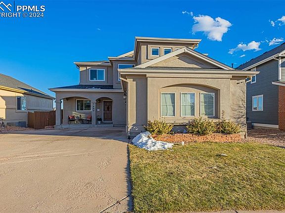 Paid off Solar panels** ALL windows in home are brand new high end Champion heat reducing energy efficient 95% UV reducing *** Views are all around on this gorgeous 2 story home that features a main level deck with a walk out basement. This home is located in D20 and sits on a beautiful lot overlooking the cottonwood creek trail recently updated with concrete bike paths. Woodmen pointe neighborhood boasts multiple parks and trails as well as a bike bath that leads to Cottonwood park one of the most notable parks in Colorado Springs. The exterior of this home features a low maintenance stucco exterior, solar panels and air conditioning. The solar panels provide the electricity for this home and have been completely paid for. The south facing side of the property features mature trees and a double retaining wall set up that allows for full use of the backyard. There is also access to the bike path right behind the home. Entering into the home you will notice a well thought out open main level with can lighting and open stairwell leading to the upstairs. The kitchen features stainless steel appliances, tile backsplash, 42” cabinets , and a large window over the sink overlooking the front of property. The main level features a primary suite, washer and dryer and garage access. The upstairs has three main bedrooms and share a hall bath. The basement features a large secondary living space, 2 additional bedrooms, storage and a decently updated bathroom. Multiple storage areas and access to the stone patio with fire pit.