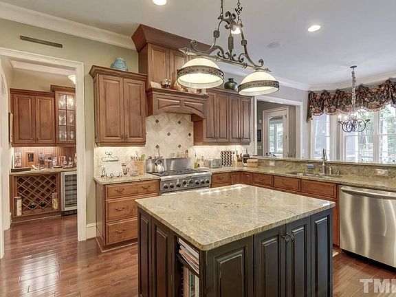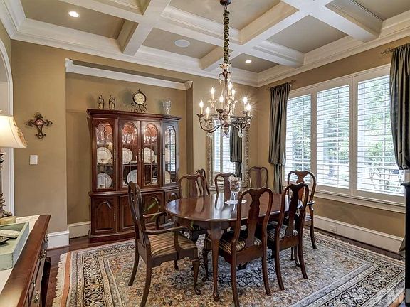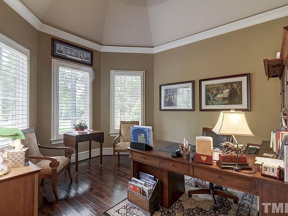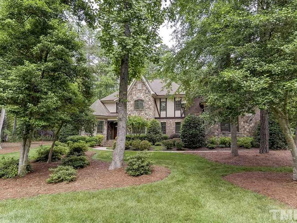 Former Parade Home loaded w/ extra features in prime NW Raleigh locale! Handscraped hwds thruout 1st flr. 10 ft ceilings. Extensive millwork. Plantation shutters. 2 master suites (1 up & 1 down)! 1st flr office w/ cathedral ceiling. Family rm features built-ins. Formal dining w/ coffered ceiling. Keeping rm offers stone wall accent. Kitchen has granite tops, center island & s/s apps. Spacious bonus rm + media rm. Vaulted screen porch + oversized deck. 4 car garage! Amazing b-yard overlooks protected area.