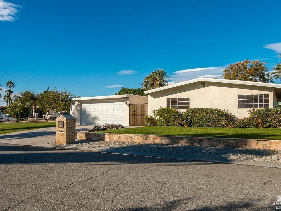 This lovely home has been carefully restored and renovated from the curb all the way through to the interior by a talented French artist. There are two beautiful and spacious outdoor living areas. Saltillo tile sets the tone for the enclosed and private sideyard, complete with relaxing fountain, bench seating, and generous, decorative tile. The backyard includes a large, covered patio with saltillo tile, wall fountain, and colorful landscaping. The lot is oversized with a generous yard. The outdoor living areas grace the indoors through the wide french-door-style sliding doors in both the dining and living areas. The interior has been upgraded w/ porcelain tile throughout, new bathroom, paint, appliances and ceiling fans. The A/C and heating systems were replaced in 2015. The house and garage roofs were replaced w/in the past 2 years. A community pool, located right beyond the back yard gate, is included with homeownership. Walking distance to The First Tee and Palm Desert High.
