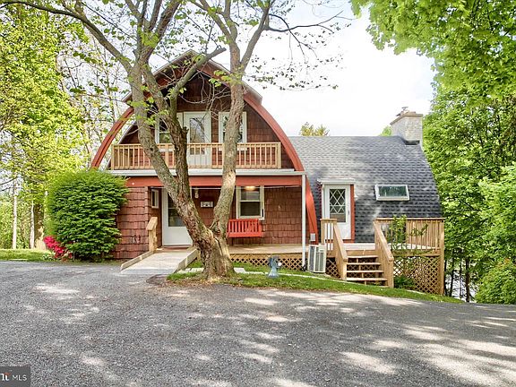 This unique property has a one-of-a-kind 19-foot double parabolic arch roof and is a car buff's dream come true! If you're looking for a place to store or work on your cars, or need a workshop, this property has everything you need. The home boasts very cool wood arched ceilings throughout, adding a rustic and charming touch to the living space and it sits on a private 1.9-acre lot with a pond, offering a peaceful and serene setting. The two detached garages have enough space to fit a total of 7+ cars! The front garage is 23x31, with pass through overhead doors to the rear garage measuring 24x30. So, whether you're a collector or just have a few cars that need a home, this property has you covered. Inside the home, you'll find a beautiful stone fireplace in the family room with a hydro hearth insert and rustic wood mantle. The rounded cathedral ceiling adds to the unique and cozy atmosphere of this space. The main level (accessed from the rear driveway) also has a bedroom and full bath with walk-in tub and separate shower, an open floor plan with kitchen, dining area and living space and an abundance of windows for lots of natural light plus a sunroom making this property perfect for those who want one-level living. A spiral staircase that spans the three levels of the home, provides access to additional living space on the second floor, which features a bedroom with an outside covered porch for relaxation and a balcony overlooking the living and dining areas with their stunning wooden arched ceiling. The spiral staircase also spans to the lower level featuring a playroom/office area, full bath, laundry area and 1 car integral garage. Other features of this amazing property include some stained glass windows, a new roof in 2021, 4 mini-split systems for heat/air conditioning and you’ll never have to worry about power outages with the whole house generator! Don't miss your chance to own this one-of-a-kind property in West Hanover Twp that offers both a unique living space and ample garage and workshop space for car enthusiasts!