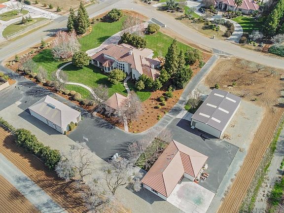 Beautiful 4 BR, 3.5 BA custom home on a 2 acre park setting with fruit orchard. Country living at its best yet close to Hwy 168 and Clovis Community Hosp. Perfect for entertaining and hobbies. Enjoy preparing gourmet meals in kitchen with custom cabinets, granite counters, stainless steel appliances and walk-in pantry. Storage and fun galore as the estate boasts a 1250 sq ft workshop (central AC, heat, 220v service, finished concrete floors, finished drywall interior) that could be converted to suit your lifestyle as well as 2 outbuildings 32x60 and 25x50 with finished concrete floors. Outbuildings are linked together by separate paved driveway. Main floor master suite with walk-in closet, jetted tub, walk-in shower and double-sided fireplace with views of the 20x20 gazebo in the backyard. Tray ceilings, plantation shutters, and custom woodwork. The upper level includes 2 BR, full bath and loft. Fully finished 3 car garage with wainscoting and crown molding.