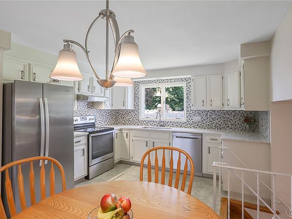 Well-maintained 4-bedroom, 2.1-bath home lovingly owned by the original owner for over 50 years. Features a large open foyer and hardwood floors throughout the living room, dining room, family room, and all bedrooms. First-floor bedroom offers flexibility as a home office. Enjoy the 10x18 four-season room with ceramic tile, beadboard ceiling, skylights, and sliding glass doors overlooking a beautifully landscaped, fully fenced large backyard with patio. Gorgeous front landscaping with black iron fencing and a brick-faced exterior adds standout curb appeal. The updated kitchen includes quartz countertops, decorative backsplash, and stainless steel appliances. First-floor laundry for added convenience. Mini-split AC systems on the first floor and in two bedrooms provide flexible, energy-efficient cooling. Upstairs features three bedrooms, including a spacious primary suite with ensuite bath. Finished lower level offers additional living space. Detached 2-car garage with extra attic storage, plus a 10x12 shed with poured concrete foundation and built-in workbench—ideal for hobbyists or extra storage. Recent updates include boiler, hot water heater, windows, interior paint, landscaping, and more. Tax records are incorrect per seller and the 1942 sq ft is all above grade. This is the place to call HOME!
