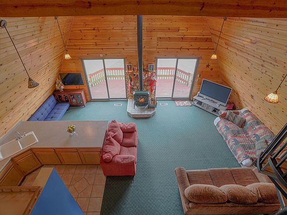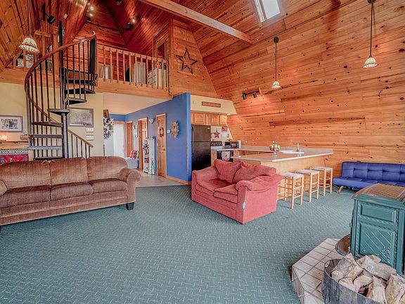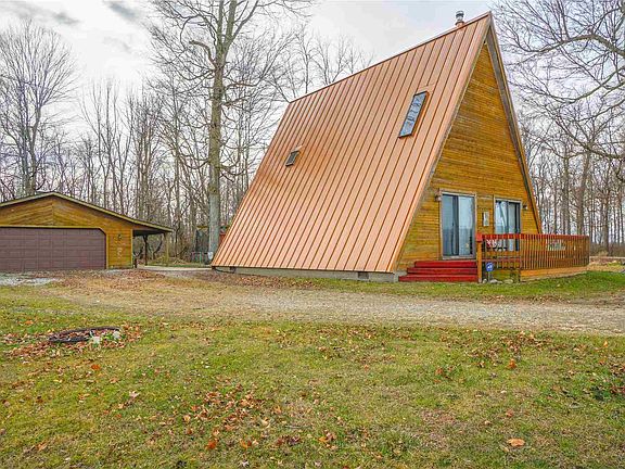 This traditional A-frame home rests on just over 1.3 acres of land. The property has several mature trees, a fishing pond, and is located on a country lot with a secluded feel. As you enter the home from the large front deck, you will notice natural wood work, a high ceiling, and wood burning stove. The main floor has an exceptional amount of space with an open concept living/kitchen area, full bath, laundry room, and bedroom. As you use the spiral staircase to access the upper level, you will notice an additional half bath, large bedroom, and balcony overlooking the yard. The detached 1.5 garage features a great amount of storage space as well as an additional porch for relaxing in your back lawn.