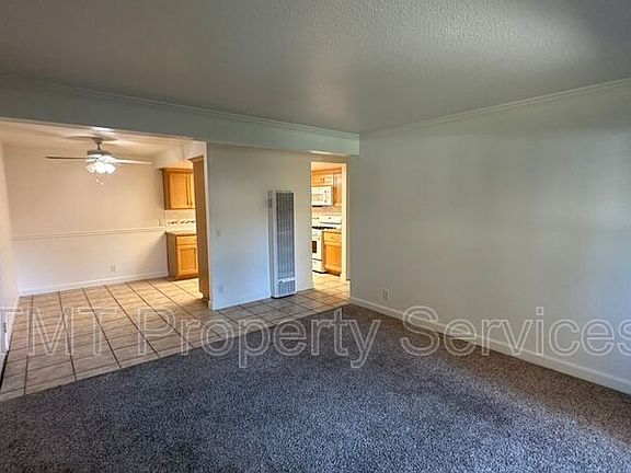 Other features include a detached, single-car garage, community pool, wall mounted heater and AC unit, and on-site laundry. Stove and microwave are included, and tenant is responsible for all utilities except trash. The initial lease term is one year, and no pets are allowed.