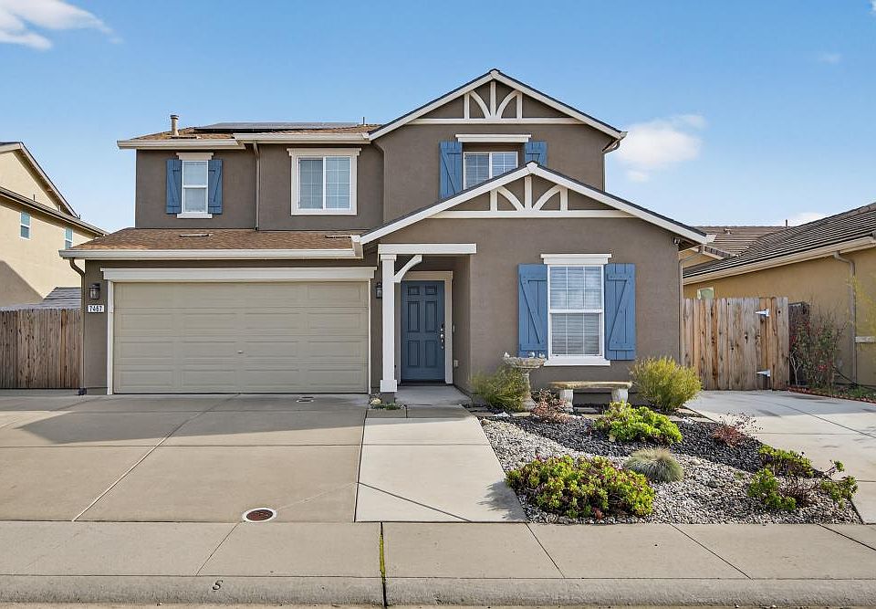 Welcome home to this spacious 5 bedroom, 3 bathroom property with an upstairs loft, located directly across the street from a peaceful nature preserve with walking trails and a small pond. It's rare to find a home with this kind of open space and scenic setting right outside your front door. The exterior of the home has been freshly painted, and both the front and backyard have been recently redone with low-maintenance landscaping, making outdoor living easy and enjoyable. The backyard is ideal for relaxing or entertaining and features a covered patio along with fruit trees and grape vines that add charm, shade, and privacy. Inside, the home features a well-designed layout with room for everyone. Downstairs offers a welcoming living room, a separate dining area, and an open kitchen that flows into the main living space, creating a great setup for everyday living and entertaining. A full bedroom and bathroom on the main level provide flexibility for guests, multigenerational living, or a home office. Upstairs, you'll find four additional bedrooms, refreshed bathrooms with new dual sinks and updated tile flooring, and a spacious loft that works perfectly as a second living area, playroom, or work-from-home space. Energy efficiency is a major highlight with 24 solar panels that will be fully paid off at close of escrow, along with Tesla Powerwalls and a Tesla wall charger in the garage. Additional features include RV access, a whole house fan, and a tankless reverse osmosis water system at the kitchen sink. This home offers the perfect balance of space, upgrades, and location, with nature across the street and everyday conveniences close by.