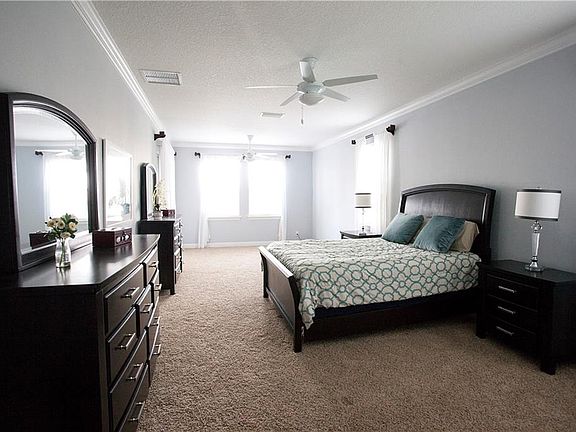 - Interior Features: Ceiling Fans(s), High Ceiling(s), Master Bedroom Downstairs, Crown Molding, Walk-In Closet(s), Window Treatments, Open Floorplan, Solid Wood Cabinets, Eating Space In Kitchen, Kitchen/Family Room Combo, Stone Counters, Coffered Ceiling(s), Thermostat