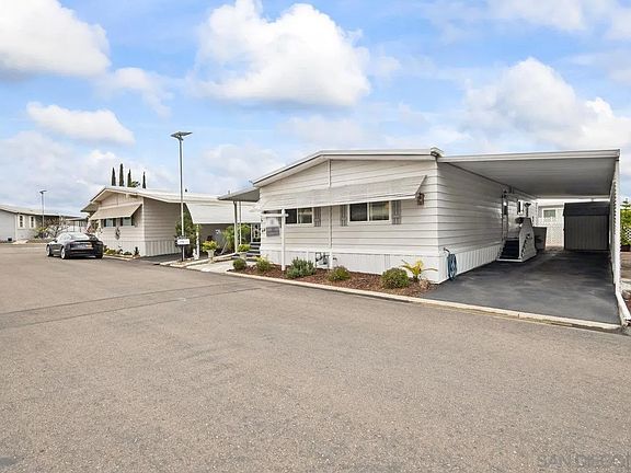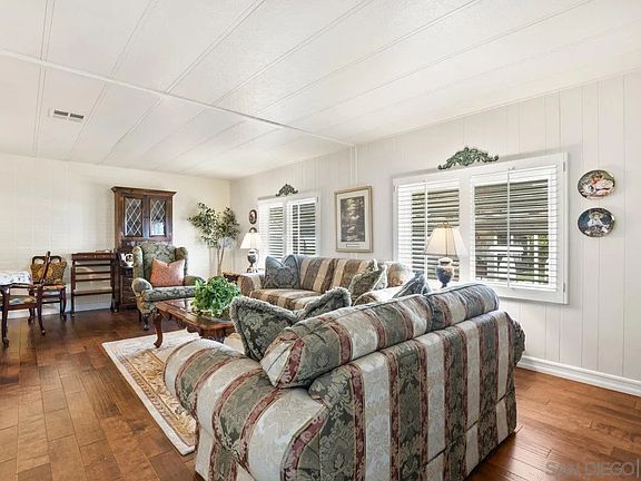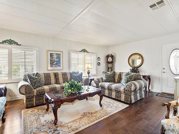 A premier park in Santee w/ a convenient location: close proximity to shopping & freeways. YES! It’s 1700SF! Double wide w/ two “pop-outs” makes this well-maintained coach highly desirable & affordable! Dual-pane windows, custom wood flooring, updated kitchen w/ granite counters, custom shutters, pure H20 filtration system, EV charger, newer exterior steps & patio carpet. Strong sense of community & camaraderie w/in the park makes it an attractive option for retirees seeking a supportive environment.