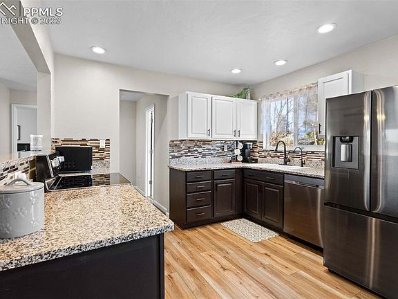 Welcome Home to this adorable bi-level in Fountain Country Club Heights! This home sits on a generous lot of nearly 8,000 square feet, with a fully fenced backyard, a separate storage shed, firepit, and huge wood deck. The attached one car garage is perfect for car enthusiasts with a pass through garage on the opposite side. There is additional parking as well. The location is perfect - with access to Fountain Mesa Park and Janitell Middle School right across. the street! Enjoy all of the soccer and football fields, basketball courts, and the amazing kids play sets available just steps away. The exterior has lots of curb appeal with fresh paint and beautiful brick accents. The interior is even more beautiful, though, with stunning Luxury Vinyl Flooring and wrought iron stair railings that make a dynamic first impression. The Main level has a spacious two-tone kitchen with black lower and pure white upper cabinets, as well as granite countertops and a mosaic backsplash. The gun-metal appliances stay with the house as well. The carpet is new, and there are double-pane vinyl windows throughout the home. The Living Room also offers a shiplap accent wall. The home offers 4 bedrooms in total, lots of storage space, and a huge Lower Level Family Room. There's great natural throughout this wonderful home.