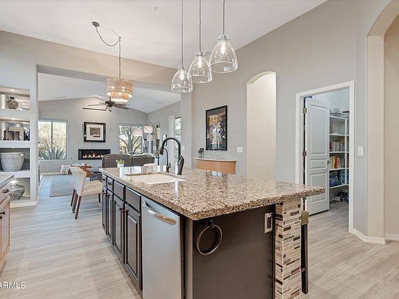 So peaceful and quiet...as you enjoy the desert and mountain views from your backyard retreat in this 4-bedroom, 3-bath home. Luxuriate in the heated spool under the stars or show off your BBQ skills on the grill -- enjoying the outdoors is effortless here. Tastefully designed, this modern home has an open-concept layout, extra cabinets everywhere, soaring ceilings, and abundant natural light. Made for entertaining, the multi-purpose great room opens to the patio and the family room with linear gas fireplace and media wall is the perfect hangout. At day's end, the luxurious owner's suite will soothe and refresh, with built-in wet bar, large sitting area, and reading nook. Owner's ensuite bath boasts a walk-in shower with dual showerheads, a jetted tub, dual vanities, and two closets.