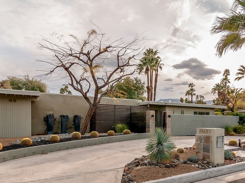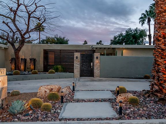 Mid-Century Modern ; Situated in South Palm Desert just minutes from downtown El Paseo, this stellar home has been tastefully updated and remodeled for today's look and yesteryears MCM sought after architecture. Enter through private courtyard into double glass doors. Easy open floor-plan, living-room with walls of glass and fireplace, plus open kitchen, breakfast bar and top of the line appliances incl. wine storage. Just outside a large outdoor living space with unique lighting, heaters, shades and BBQ. Beautifully landscaped low-maintenance yard offers a peaceful and private setting with multiple sitting areas, water feature and private spa to relax in. You will love the master suite, spacious and private, with large walk-in closet and spa like bath with both large shower and soaking tub. There are two guest rooms, one with direct rear patio access used as a den. Double garage with tons of storage and individual laundry room plus a shared pool just steps away.