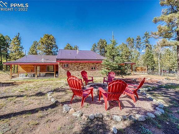 Don't let this beautiful ranch home with expansive ceilings get away from you. This main level open concept home lives large and is great for entertaining. The master bedroom has an attached bathroom with jetted tub, walk in closet and access to a private covered patio with a hot tub and a gas fireplace. The second bedroom is large enough to hold 2 queen size beds and the loft has been used as a non conforming 4th bedroom. The kitchen is spacious with lots of cabinets. The dining room is large enough to a hold a table that will seat 12 people. The living room has a nice wood burning stove for those cold winter nights. This home has been used as a short term rental the past 2 summers sleeping up to 12 guest. Residence have access to join the Lost Dutchman Resort for fishing. Mountain views to the West can be enjoyed from the loft. The additional 12 by 12 playhouse has electricity and a loft. There is currently no garage but plenty of space to add one. 50 amp RV hook ups with connection to the septic system is connected to the home for your extra guest. The outdoor fire pit and covered porches are great for enjoying the mountain life and abundance of wildlife. The location is close to hiking, biking, Mueller State Park, The Florissant Fossil Beds, ATV trails and lots of fishing.