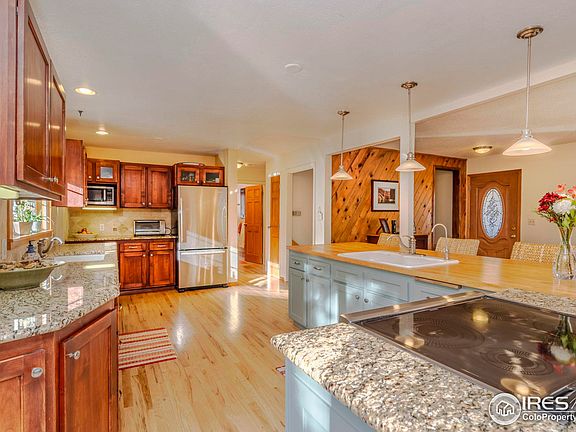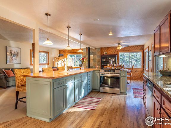 Ask about $10 K Buyer Incentive from the Listing Office. Nestled in the serene beauty of the Boulder Foothills, this eco-friendly home sits on a sprawling 2.6 Acre property, offering a tranquil retreat just 7 miles from downtown Boulder. The open floor plan seamlessly connects the Living, Dining, Kitchen areas & the south facing Deck, creating a warm and inviting indoor/outdoor atmosphere for entertaining. The well-appointed Kitchen boasts modern SS Appliances, Induction Range, Custom Cabinets by Thad Custom Cabinets, Granite & Maple Countertops, 2 Sinks & Spacious Pantry. Primary Bedroom opens to a private Patio with a Hot Tub via spacious French Doors. Bathed in year-round sunlight, this home is designed to embrace the stunning Mountain Vistas that surround it with large LoE Double Pane Fiberglass Frame Windows. This energy efficient residence features 1.98 kW Owned Solar PV Panels, & a super insulated structure to minimize utility bills. The expansive 2.6 Acre property offers endless possibilities for outdoor activities such as gardening, hiking & sledding. The location offers a flat driveway, county maintained roads, fenced Yard, and neighborhood Trails that connect to the Betasso Recreation Area. The attached 2 Car Garage and the 150 sf TUFF Shed provide storage space for outdoor gear, etc. Just a short drive to downtown Boulder, you can easily access the vibrant city life, cultural events, and outdoor activities that the area is known for, while still enjoying the peace and privacy of mountain living. Whether you're drawn to the allure of mountain living lifestyle, the eco-friendly features, or the proximity to both nature and city amenities, this move-in ready sunny mountain house offers a perfect blend of value, comfort, and tranquility. Recent upgrades & features include: 2017 Roof, New Hi Efficiency Furnace, Reverse Osmosis Water Filtration, Water Softener, 2 low emission Wood & Pellet Stoves, Owned Solar Panels. Septicsmart Cert issued Dec 2023