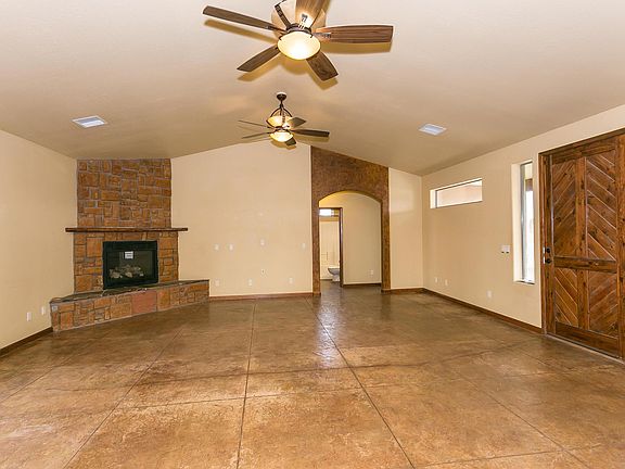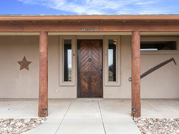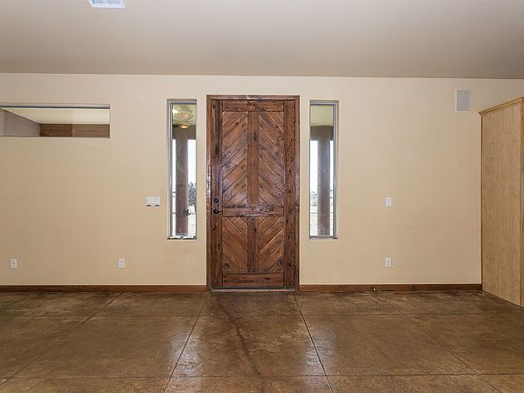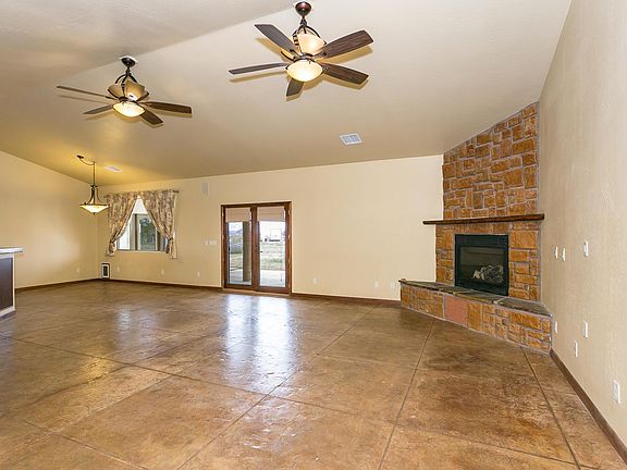 Wow, rural living at its best! This well maintained home with a western flair has an enormous open living area that accommodates the living room, kitchen & dining area all with vaulted ceilings and is ideal for entertaining with family & friends. Easy maintenance stamped & stained concrete floors in the entire home, beautiful stained solid wood front door & a exterior retractable screen door, stained solid wood interior doors & baseboards throughout the home. Living room with a stone front gas fireplace, French doors that lead to the back covered patio. Kitchen has Alder wood cabinets, composite type sink, large island with breakfast bar, tile counter tops, plenty of storage, large walk-in pantry in hallway off kitchen, spacious dining area that will accommodate a large table. Huge master