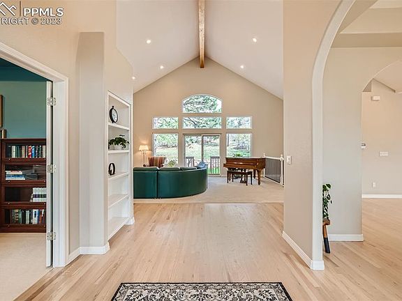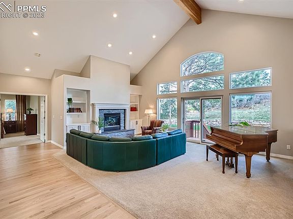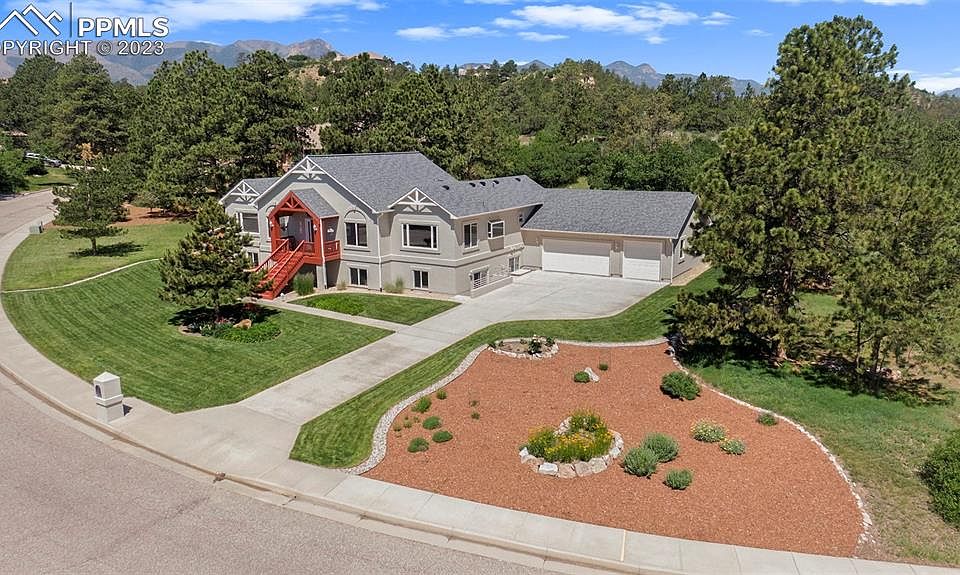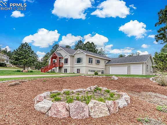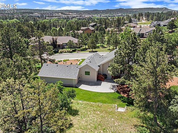 Beautiful ranch in Woodmen Oaks subdivision, Academy School District 20. Private backyard surrounded by Ponderosa Pines, offering serenity and privacy. Immaculate home with impressive soaring ceilings and open layout. The great room features a stone-clad gas log fireplace and a massive center wood beam. Walkout access to a spacious wood deck and lush backyard. The kitchen is a stunning and recently remodeled with a large quartz-clad breakfast bar, two expansive pantries, Wolf Gas cooktop and oven, separate double oven, soft-close drawers, and a generous eat-in area. Perfect for enjoying meals while appreciating the beautiful surroundings. The master bath is extraordinary and gorgeous. It includes a huge luxurious and very comfortable Japanese soaking tub for ultimate relaxation, a large walk-in shower plus his and hers vanities conveniently located near the separate his and hers closets. The tile floors are heated providing for year-round comfort. The sizable master suite offers ample space and is conveniently situated near the expansive formal study. The lower level is designed for entertainment, featuring three spacious bedrooms, each with ensuite baths and walk-in closets. A stunning wet bar with quartz counters adds a perfect gathering spot for guests and family in the walk-out recreation room. The expansive backyard offers ample space for privacy and outdoor parties under the starry sky, surrounded by majestic pine trees. Keep an eye out for deer that often peer at you from the scrub oak bushes, adding to the natural beauty of the lush green yard.