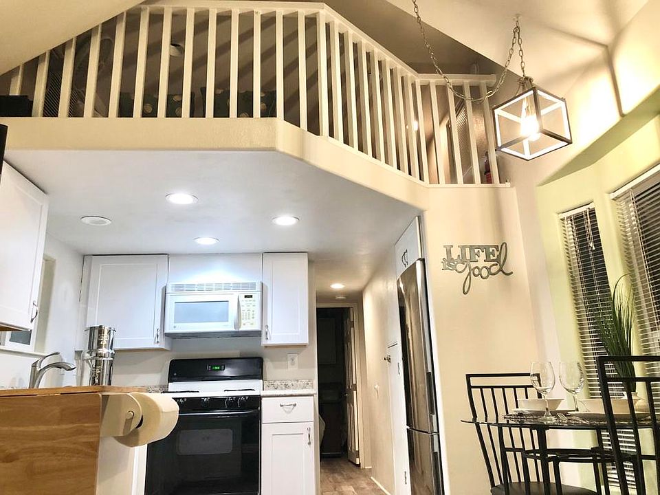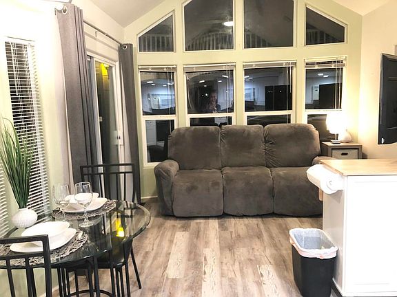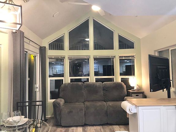 PANORAMIC VIEWS on this lovely 2006 CAVCO park model with LOFT, partially enclosed deck, lower yard, shed, and driveway!New luxury vinyl plank flooring and kitchen cabinets with island.All aged family park with 13 hot spring mineral pools, pickleball, library, gym, walking trails, concerts, cafe, chef, ponds and more!