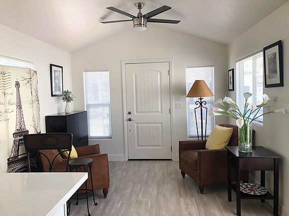 LOWEST SPACE RENT in the resort!$644 per month includes trash and sewer.No annual property taxes or monthly HOAs.Annual DMV registration.Completely remodeled modern park model with all new appliances, quartz peninsula countertop, new upgraded bathroom, kitchen and more! Front porch with view of hills that border Joshua Tree National Park, 6' vinyl privacy fence borders the spacious yard with a shed and more!Sky Valley is an active ALL AGED park featuring 13 hot spring mineral pools, pickleball, tennis, many groups and activities, cafe/bakery, chef and so much more!