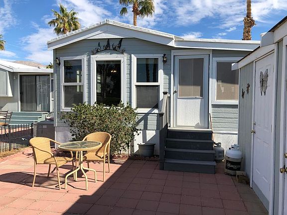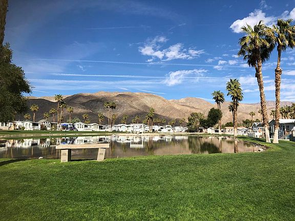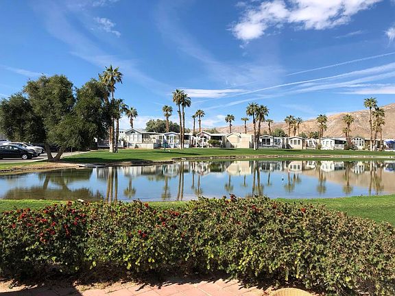 Lovely park model with VIEWS of pond and amazing sunsets. Covered deck, California room, shed divided between storage and mini golf cart garage. Pond side patio is bordered by bottle brush landscaping.Sky Valley Resort is an active ALL AGE community which features 13 sparkling hot spring mineral pools, pickleball courts, fitness center, walking trails, classes, activities, tennis, peaceful ponds and greenbelts and dog parks. In high season, there is a cafe and chef that delivers dinner.