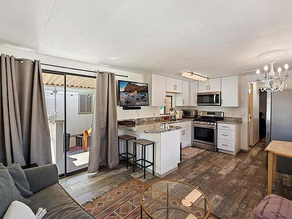 Welcome to Sky Valley Resort! This charming 1-bedroom, 1-bath 1988 home offers comfort and style with many recent upgrades, including a refreshed kitchen, new flooring, modern appliances, updated windows, and a convenient laundry area inside the shed structure. Private patio area and a nice large shed for storage. Only steps away from the East Club House. Enjoy resort-style living in this beautiful gated community featuring 13 natural hot mineral pools and spas, a fitness center, sauna, tennis, pickleball courts, cafe, chapel, and a dog park. Different activities are scheduled in the club house daily. Short Term Rentals are Allowed with Restrictions. This home is DMV Registered and doesn't have Property Taxes. Space rent is $920 per month, on a privately owned leased land. Experience the relaxing desert lifestyle and all the wonderful amenities Sky Valley Resort has to offer!