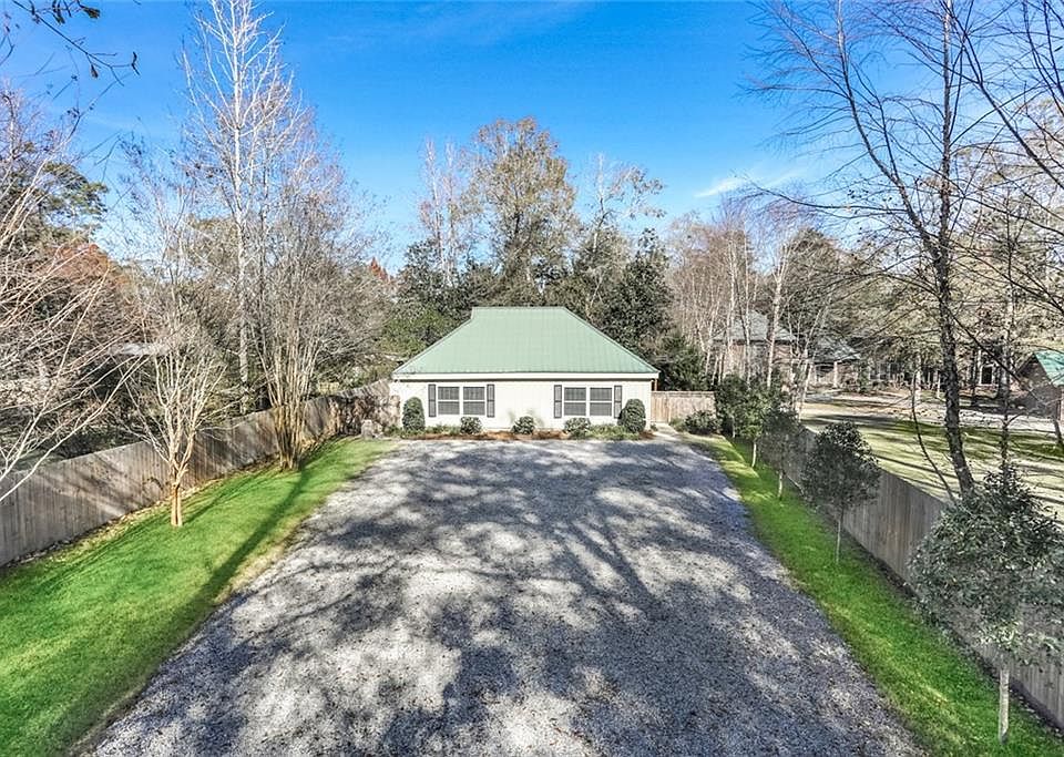 A rare find on beautiful River Road on the scenic Bogue Falaya River! Enjoy the simple life of low maintenance, with the complete enjoyment of outdoor living! 530 sf covered deck is ideal for entertaining with fans and lighting! The main room features cathedral ceilings with beautiful, rustic cross beams! Granite counters, island, white cabinets finish out the open kitchen! Tons of natural light flow from the many windows and french doors. Generous bedrooms and baths! The 3rd bdrm houses the washer/dryer.
