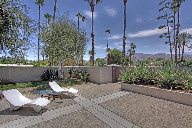 Exceptionally gracious MID-CENTURY MODERN located in desirable SOUTH PALM DESERT is styled to please. Very convenient location just minutes from the restaurants and shops on El Paseo. This crisp clean home offers an open, bright and airy floor plan, vaulted wooden ceilings, cozy fireplaced living room leads out to pool side patio, efficient step-saver kitchen, good sized Master Suite opens out to private patio by pool, two guest bedrooms each with sliding doors lead out to a large private patio. Beautiful Oak Hardwood floors run through hallway, living room and kitchen. Lush landscaped yard wraps around property with a very spacious front patio and superb MOUNTAIN VIEWS. Lounge around the inground pool made for swimming serious laps and surrounded by matured plantings for total privacy. A stucco wall surrounds the property with smart double gates providing a distinctive front entrance. Two car garage with small workshop and extra storage. A VERY UNIQUE HOME.Front Patio shows splendid Mountain Views and has space for easy entertaining for friends and family.
