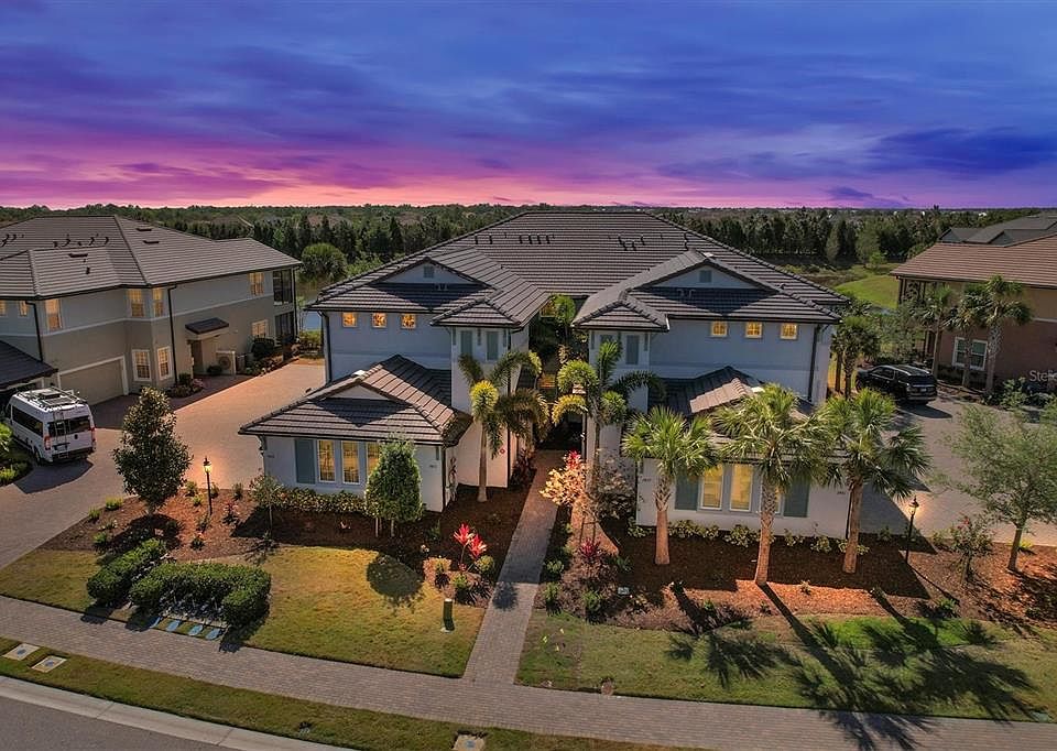CLUBSIDE at Country Club East in Lakewood Ranch-The "Montserrat Model", a gracious courtyard greets you to this 2376 square foot COACH HOME constructed by the very well respected WCI builder. As you enter the front door, your elevator is to the left and a stately hardwood staircase with new wood and iron bannisters to the right. Your new maintenance free condo boasts 3 bedrooms (split plan), den/study, 2 bathrooms and an open floor plan for the Great room, kitchen and dining room. Take in the vistas of the LAKE and PRESERVE from several rooms and the abundant sized lanai with tile that matches the interior. The gourmet kitchen has a matching suite of stainless-steel Whirlpool "GOLD" Series appliances that includes a gas stove/range PLUS breakfast bar island, a walk-in pantry, granite counters w/subway tile backsplash. The master bedroom has a Tray Ceiling, carved wood engineered flooring, lanai access, walk in closet with built-ins, full glass shower enclosure, water closet and dual sinks. Features include a decorative electric fireplace, plantation shutters accompanied with stylish draperies, freshly painted throughout utilizing a designer palette of colors, high ceilings with crown molding, decorator millwork and chair rail, upgraded light fixtures, ample-sized laundry room with laundry sink, hurricane impact sliders, transom windows, tankless hot water and a two-car garage with epoxy coating floor. Built in 2017 with stringent and current fire protection contributing to peace of mind AND enviable property insurance rates. Country Club East is a gated and maintenance free community offering resort style amenities nearby at "The Retreat"complete with a state of the art fitness center, club room, resort style pool. Optional membership to Lakewood Ranch golf & private country club with 3 courses, tennis/pickle ball, Polo Fields, fitness, 150 miles of parks and trails. Lakewood Ranch offers multiple waterfront "Main Street" themed districts with plenty of restaurants, movie theatres, shopping, farmer's markets and festivals, etc.