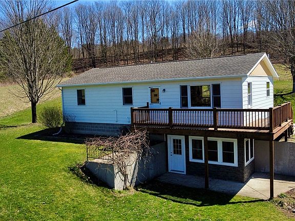 Discover the charm of this picturesque 2-bed, 1-bath home nestled on ~4 acres of land, offering breathtaking views that enhance its serene beauty. Enjoy the expansive view from the spacious living room, which overlooks the front deck & captures the appeal of the surrounding scenery. The attractive & sizable eat-in kitchen, features ample cabinetry & the addition of sliding glass doors leading out to the back deck not only brings in natural light but also extends the living space flawlessly. The spacious master bedroom is a rare find, offering ample space & comfort that is not often found in homes of this period. Add your personal touch to the large full basement, which comes equipped w/ plenty of storage space & plans for a partially started 3rd bedroom are available to the new buyer. The cozy back porch serves as an ideal spot to relax, unwind, or entertain, offering a serene view of the backyard's beauty & captivating skies. Updates: '16-House was raised & back deck constructed, roof replaced w/ full coverage ice & water shield & new GAF Timberline HD shingles; '17-front deck reconstructed. Offers reviewed as received.