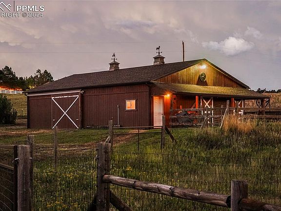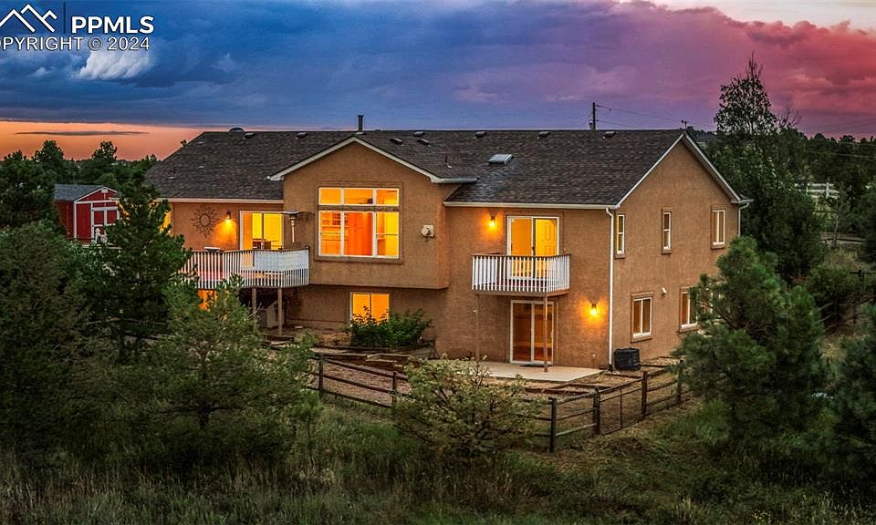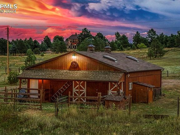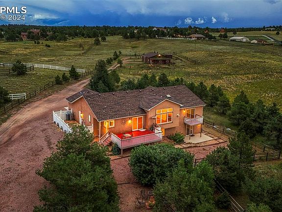 Impressive Black Forest rancher with sweeping Pikes Peak and mountain views, garage parking for 10+ vehicles on 5 acres of trees and meadow with a barn and workshop. The home features almost 3,700 square feet, full main level living, 4 bedrooms, 3 baths and a 2 car attached garage. The 48x32 barn/workshop could be used for multiple purposes. Currently w/ two stalls, a 16x8 tack room and the remainder of the building is a 1,400 sq ft open area with concrete floors. The barn has water, electric, two 16x10 sliding doors. The 44x24 detached garage has a separate large workshop area with built-ins, three insulated 10x9 overhead doors, 110v and 220v electrical. Expansive great room with a wall of windows allowing natural light to flood in while enjoying the gorgeous mountain views, oak hardwood floors, a gas fireplace, vaulted ceilings and a walk-out to the back deck. The kitchen is open to the great room w/ an abundance of cabinets, granite counters, stainless appliances including a gas range, island hardwood floors, pantry kitchen nook eating area and mixture of glass front cabinetry. Main level primary suite w/ private balcony, walk-in closet, hardwood floors and an updated 5 piece bath including a jetted tub and seamless glass shower. Finished walk-out lower level with luxury vinyl plank floors, a wet bar, spacious family room, two additional bedrooms and an updated bath with hickory cabinetry. Multiple outdoor entertaining spaces all providing a special view and setting with the front porch, flagstone patio perfectly tucked in the trees, lower level patio, master bedroom balcony and the back deck. New roof installed in 2023, central air conditioning, low maintenance stucco exterior. The property is completely fenced with pasture areas for your animals. Award winning Lewis Palmer School District 38. Zoned for horses and outbuildings. Amazing north El Paso County location w/ quick access to Hwy 83 and I-25. Easy access to Colorado Springs, Monument and Denver.