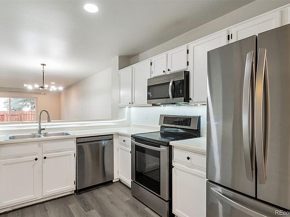 Lovely condo in coveted Cherry Creek School district. Unit features an open floor plan; spacious living room w/ fireplace and slider to private patio, dining area and roomy kitchen with abundant cupboard and counter space plus stainless steel appliances. Primary suite features en-suite full bath, skylight and abundant closet space. Large 2nd bedroom w/ adjacent full bath. Unfinished basement w/ egress window easily converted to 3rd bedroom or family room, plus storage. Step out onto the private fenced patio, perfect for entertaining or pets. Attached garage plus reserved parking space plus ample open parking for guests. Updated flooring, fresh paint, recessed lighting and smooth ceilings make this unit move-in-ready! The complex includes pools, tennis courts, hot tub and clubhouse. Enjoy all the benefits the area has to offer with biking and walking on the nearby Highline Canal and Cherry Creek trails and Cook Park with it's recreation center. Close to shopping, dining and entertainment.