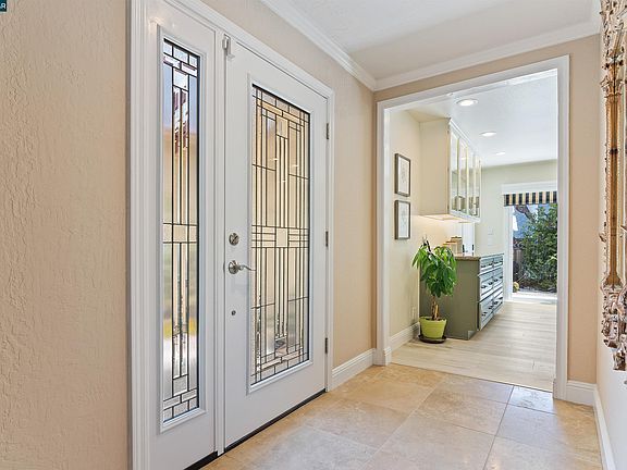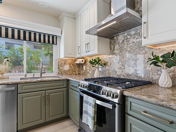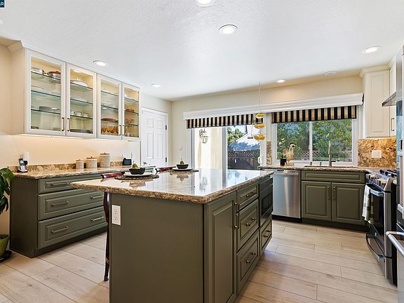Gourmet kitchen in the single story with no steps inside home. Kitchen features include designer cabinets, walk in pantry, stainless steel appliances including slide out drawer microwave for easy access. Walk in pantry. Enjoy eating at the large island with easy access to appliances, even an "elevator" for your Kitchen Aide mixer! Walk into the living room and dining room combination where vaulted ceilings with crown molding and luxury vinyl flooring throughout give this home a sense of space and light. Enjoy the electronic starter for the gas fireplace or open the skylight with it's electronic controls. Beautiful updates to the Primary Bath and hall bath as well as functional updates to the heating, air conditioning and water heater make this buyer ready. Walk to award winning Country Club Elementary. Pine Valley Middle School and California High are also close and part of the award winning San Ramon Valley Unified School District. No HOA