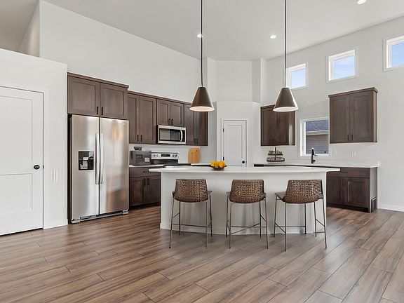 The primary bedroom is a serene retreat featuring double sinks and a walk-in closet. The upper-level laundry with a washer and dryer included adds convenience to daily life. You'll love the stunning vaulted ceilings, modern appliances, and beautiful granite countertops. Outside is perfect for relaxing and enjoying the lush green yard. Follow the link for a virtual tour! **Pictures do not reflect the interior fixtures of the listed home. Please call us today to schedule an in person showing!