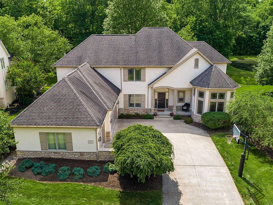 Stunning Romanelli & Hughes custom home featuring a beautiful first floor owner suite nestled on nearly a .5 acre treed lot with pond view plus a private screened porch and patio! This incredible home offers a very open design with nearly 5,200 square feet including a fantastic finished lower level. The entry level offers a beautiful island kitchen with stainless steel appliances, granite and morning room with cathedral ceiling, a two story great room, dining room and a gorgeous two story library. The second level offers an en-suite and Jack-N-Jill suite, all with walk-in closets. The lower level completes this beauty featuring a large wet bar, media area, bonus/flex room and half bath. Just minutes to The Lakes Country Club, bike paths, schools, dining and shopping. An impressive design!